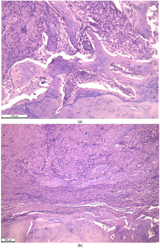 Histological analysis was performed in the Laboratory of Digital Microscopic Analysis (Moscow, Trubetskaya str., 8, p. 2, SIC, head–PhD, Associate Professor Fayzullin A.L.). Tissue samples were fixed in 10% neutral buffered formalin, then decalcified in an electrolyte solution based on hydrochloric and formic acids (Ergoprodaktion LLC, Russia) for 14 days. Next, the materials were poured into paraffin blocks with a rigid orientation, providing vertical sections perpendicular to the gum surface. Section 3 and Section 4 microns thick were stained with hematoxylin and eosin. Microscopic analysis was performed using a LEICA DM4000 B optical microscope with a LEICA DFC7000 T digital camera and LAS V4.8 software (Leica Microsystems, Germany). The following factors were assessed: cellular composition, the presence of bone trabeculae in the area of the defect, remnants of bone-plastic material, signs of inflammation (exudation, microbial colonies, neutrophil infiltration, giant multinucleated cells of foreign bodies, etc.), as well as the state of microcirculation.