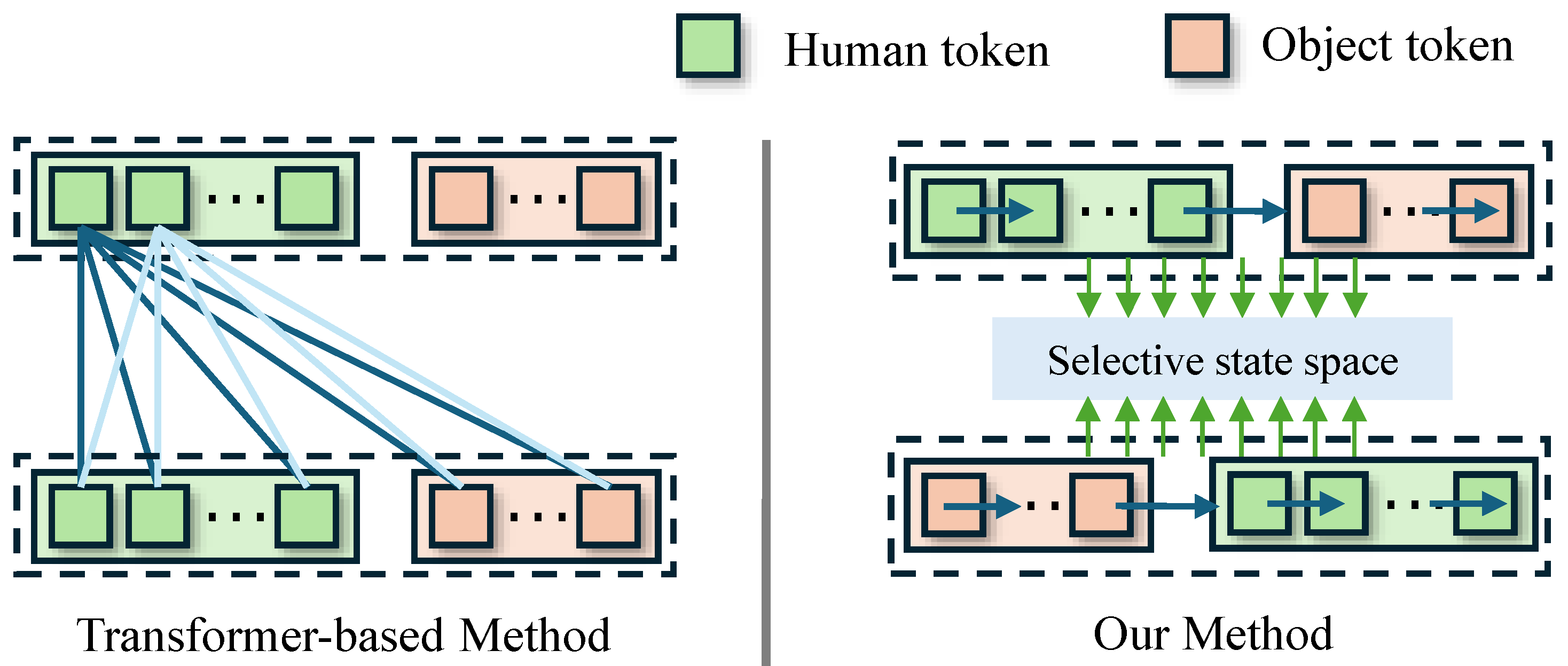 - Sequence Ordering. Tokens are concatenated in a fixed semantic order: joints, human vertices, and object vertices. Within each entity, tokens follow predefined joint hierarchies or mesh topologies. The fixed semantic order (joints → human vertices → object vertices, with internal topologies) is designed to impose a structured traversal over the interaction graph. This deterministic ordering allows the state-space models (SSMs) to accumulate interaction evidence in a controlled and spatially meaningful manner, which mimics a progressive scan of the human–object constellation. This design provides a strong structural prior for the SSM, which is crucial for capturing the long-range dependencies between distant body joints and the object, as well as local contacts.