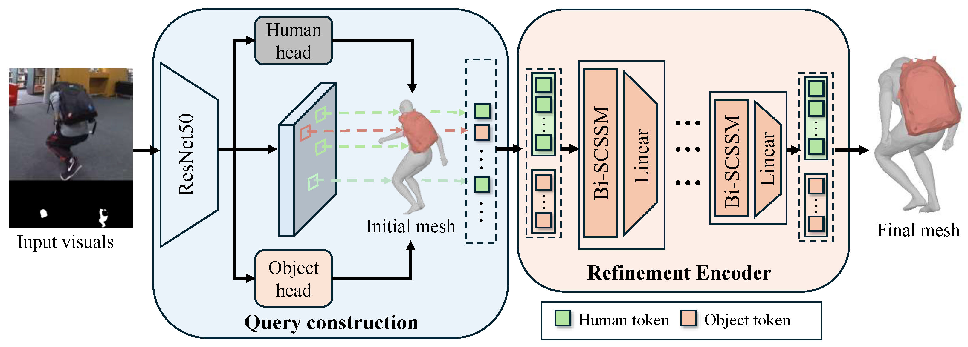 - We propose HOIMamba, a bidirectional state-space framework for monocular 3D human–object interaction reconstruction.