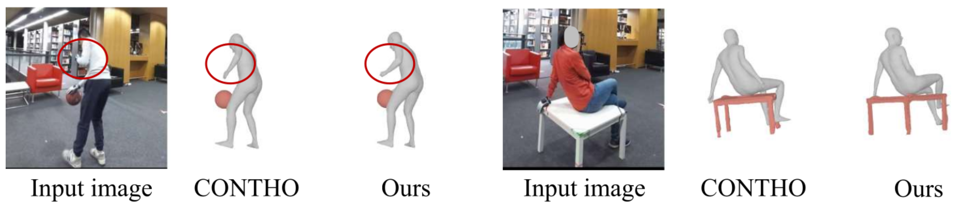 - Nam, H.; Jung, D.S.; Moon, G.; Lee, K.M. Joint reconstruction of 3d human and object via contact-based refinement transformer. In Proceedings of the IEEE/CVF Conference on Computer Vision and Pattern Recognition, Seattle, WA, USA, 16–22 June 2024; pp. 10218–10227. [Google Scholar]