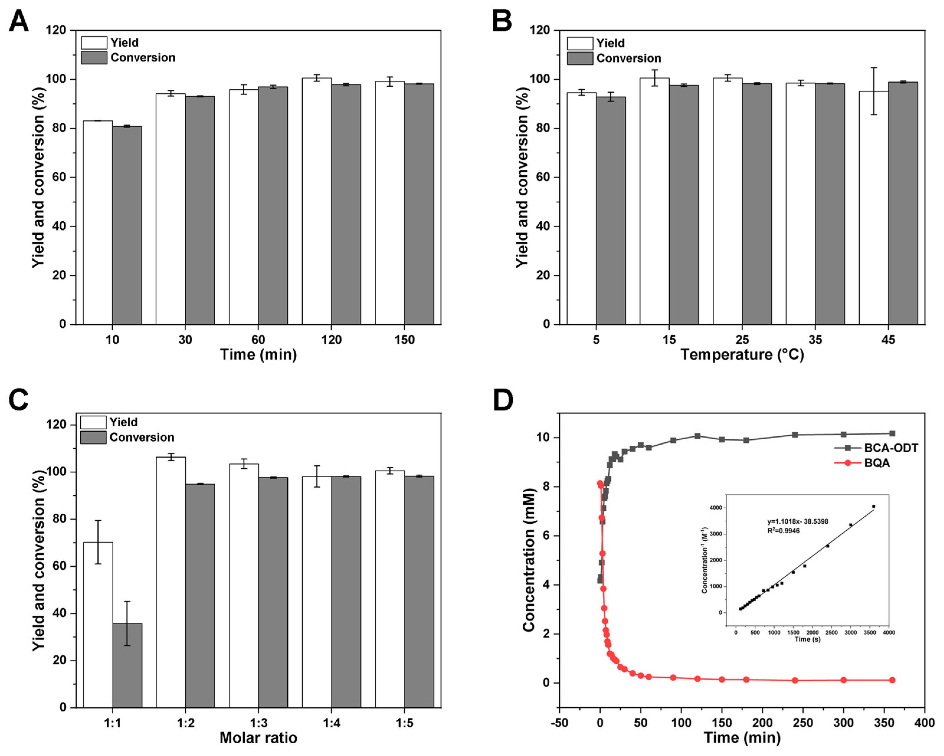 After the addition of ODT, the color of the mixture solution was changed immediately from dark red to pale yellow, indicating a rapid consumption of BQA [