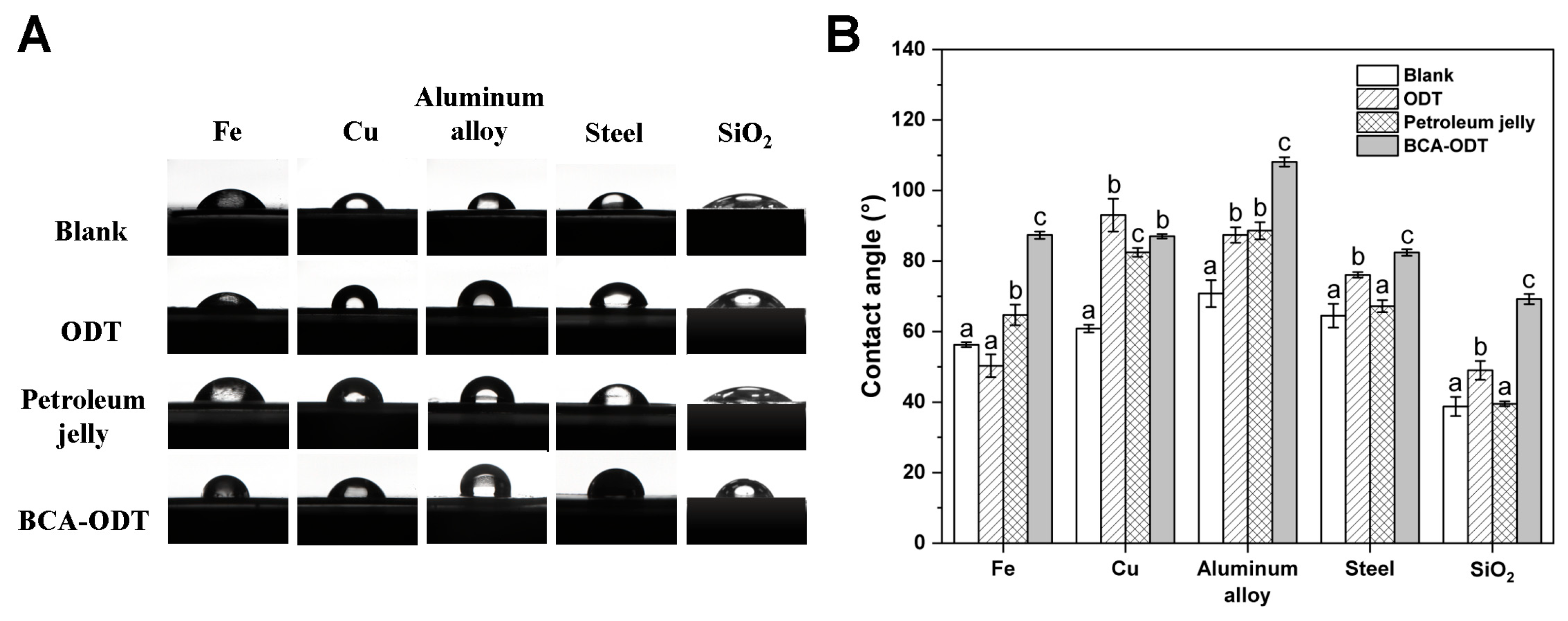 Figure 5B). Consistently, the change in the water contact angle on metal and glass surfaces treated with BCA-ODT after 24 h of air oxidation was negligible, indicating that the adhesive strength and lubrication performance of the lubricating film were well preserved, which further demonstrated the excellent oxidative stability of BCA-ODT (