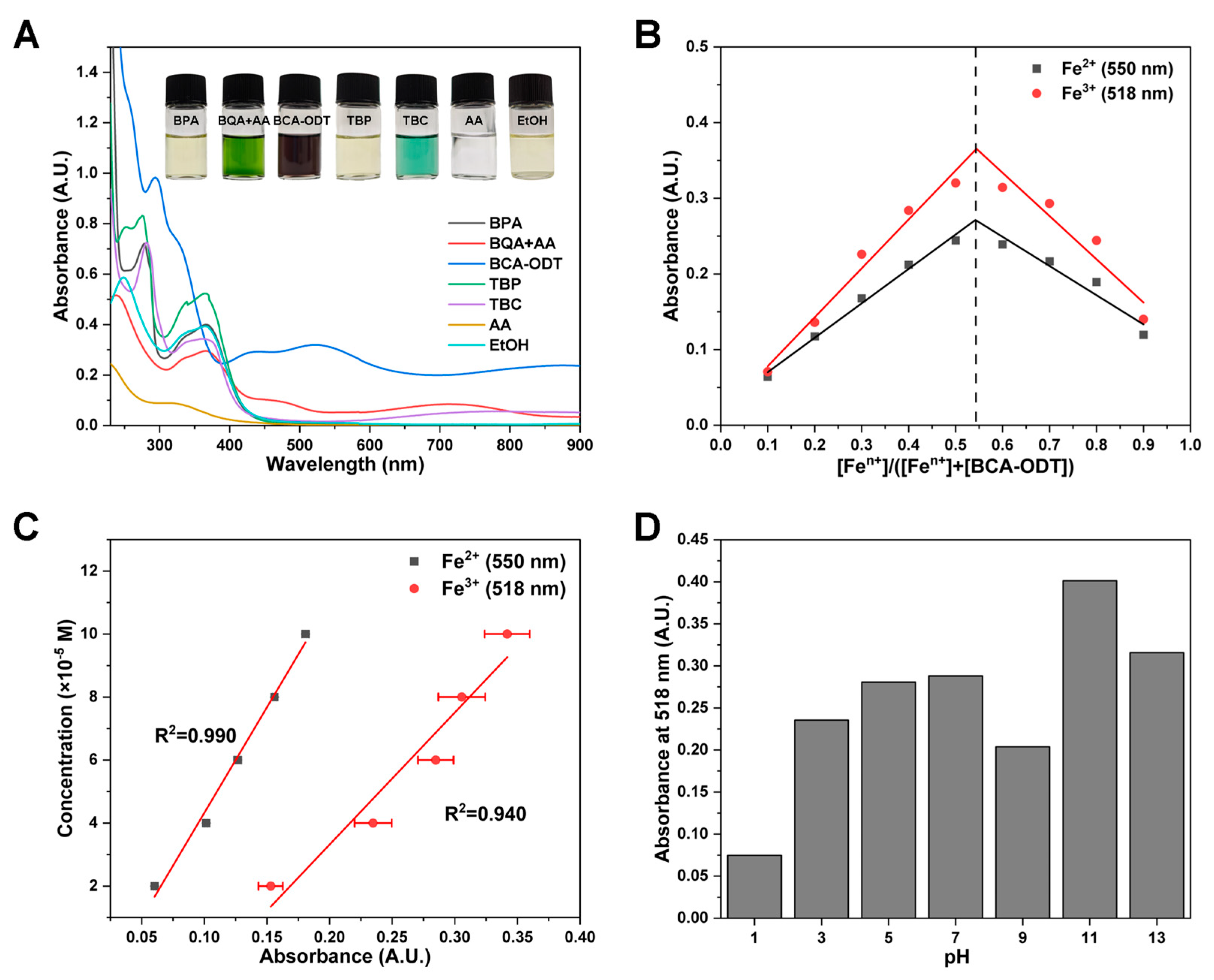 Figure 4A), a new absorption band appeared at 550 nm after the interaction between BCA-ODT and Fe
