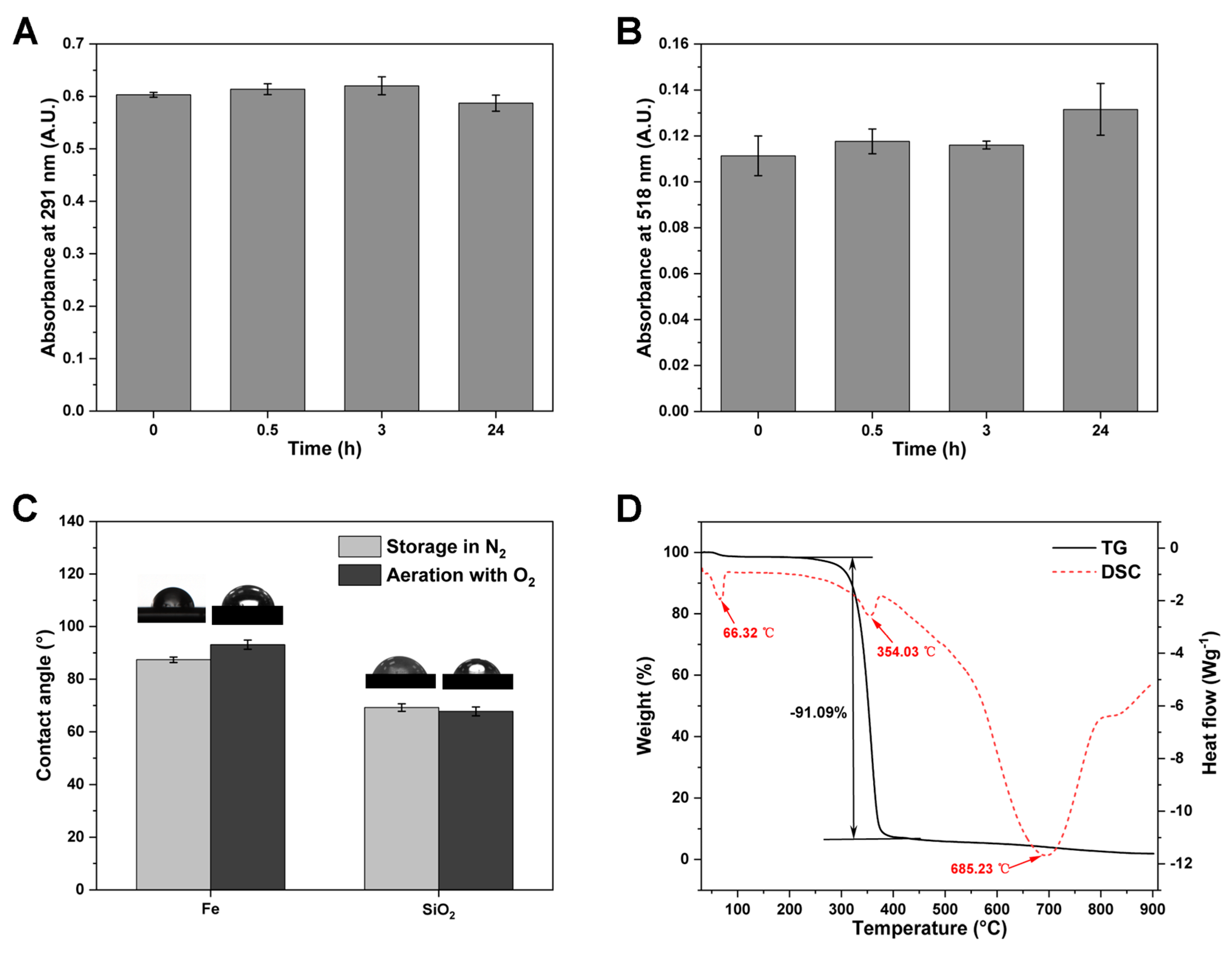 Upon aeration with oxygen for 24 h, the absorbance of the characteristic peak at 291 of BCA-ODT remained nearly unchanged, indicating that the catechol structure in BCA-ODT exhibited good resistance toward autoxidation (