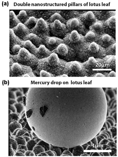 Lotus effect. Scanning electron microscopy (SEM) images of (a) double nanostructured pillars on the surface of a lotus leaf and (b) composite mercury drop on top of the rough surface of a lotus leaf making a large contact angle. Adapted with permission from []. Copyright 2004, American Chemical Society.
