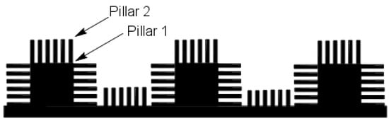 Barthlott and Neinhuis [] first collected data on how dirt-contaminated lotus leaves self-cleaned themselves due to their superhydrophobic characteristics. It was years later that the researchers found that it was the effect of surface roughness and the wetting regime of the lotus leaf surface that resulted in the self-cleaning effect. Furthermore, it was found [] that the surface roughness of a lotus leaf was due to multiple nanostructured pillars (Figure 2a) (with sizes in the range of 200 nm to 1 m) on its surface. Figure 2b illustrates a drop of mercury on the surface of a lotus leaf. Thus, it was now possible to fabricate a design that would mimic the superhydrophobic behavior of a lotus leaf. A double-pillared structure design as shown in Figure 3 is found to be best suitable for fabricating superhydrophobic self-cleaning surfaces by greatly amplifying the contact angle.