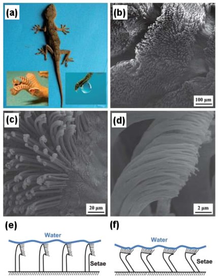 Gecko lizards are found throughout the world in places with warm climates. They are of particular importance due to their feet, which allow them to climb any surface whether smooth or rough, inverted or vertical, without any problem. This characteristic feature of gecko feet results from their unique microstructured setae (3–7 m in diameter and 20–70 m in length), which are keratinous hairs present in millions on the surface of their feet, and each seta is further subdivided into hundreds of nanostructured spatulae (100–200 nm in diameter). The setae are superhydrophobic in nature, making a contact angle of 160 with water []. However, it has also been found that not only these setae showed superhydrophobicity, but also an adhesive property towards water. This is a very unique dual characteristic behavior of gecko feet, which make them superhydrophobic, as well as highly adhesive towards water at will. The adhesion property is temperature-dependent as observed by Niewiarowski et al. [], who found that adhesion of gecko feet towards a water droplet was halved at 32 C than at 12 C.