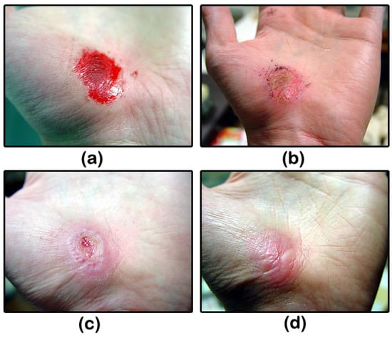 Skin wound healing. Hand abrasion (a) on the day of injury; (b) three days after injury; (c) 17 days after injury; and (d) 30 days after injury.