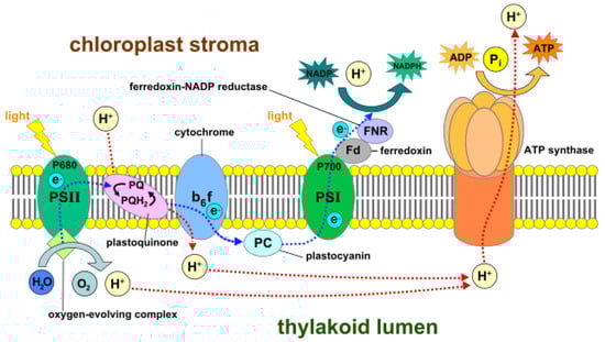 Inside autotrophs, i.e., self-feeding plants, photosynthesis is carried out in special structures of the plant cell called chloroplasts. Photosynthesis is a two reaction set mechanism: (i) light-dependent reactions [] and (ii) the Calvin cycle [], as depicted in Figure 8 and Figure 9, respectively. Chloroplasts contain small disc-like structures called thylakoids [], which are surrounded by colorless fluid stroma. Light-dependent reactions occur in thylakoid, whereas light independent reactions or the Calvin cycle occur in stroma. Thylakoid converts light energy from the sun to chemical energy, which ultimately drives the synthesis of glucose. Each thylakoid contains a pair of photosystems called photosystem-I and photosystem-II, which work together to achieve this goal. These photosystems contain chlorophyll molecules, which capture incoming photons of light, thereby exciting their electrons to a higher state. These excited electrons are emitted and channeled to a single chlorophyll molecule called the reaction center chlorophyll. Photons strike both photosystems simultaneously.