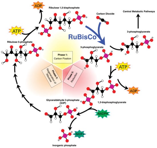 The Calvin cycle. Phase 1: Carbon fixation by ribulose-1,5-bisphosphate carboxylase/oxygenase (RuBisCO); Phase 2: Reduction; Phase 3: Regeneration of ribulose-1,5-bisphosphate.