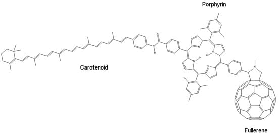 To fabricate a model mimicking the photo-induced electron transfer mechanism or an artificial reaction center, we require an electron donor/acceptor chromophore, which is able to absorb visible light and can be bonded to another electron donor/acceptor moiety for generating the necessary charge generation. One such system can be designed using molecules of porphyrin, fullerene and carotenoid, as shown in Figure 10. Porphyrin, being less stable, mimics the chlorophyll present in plants. Fullerene (C60) behaves as the electron acceptor. Porphyrin (P) and fullerene when bonded covalently provide electronic coupling, which mimics the photo-induced electron transfer mechanism of the natural reaction center.