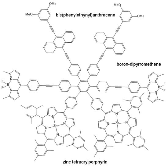 One such type of artificial antenna morphology is illustrated in Figure 11 []. In this model, bis(phenylethynyl)anthracene (BPEA), boron-dipyrromethene (BDPY) and zinc tetraarylporphyrin (ZTAP) act as primary light absorbing components. BPEA absorbs strongly at around 450 nm, which represents the blue region of the electromagnetic spectrum; BDPY absorbs at 513 nm, which is close to green; and ZTAP absorbs at 418 nm (Soret region), and also at 557 nm and 598 nm, corresponding to the orange and red wavelengths of the electromagnetic spectrum, respectively. Thus, this model absorbs photons from almost the entire visible spectrum of light, which is usually the case with natural antenna systems. This antenna unit can then be attached to a charge separation unit like fullerene [], which is a part of the artificial reaction center, thus completing the artificial photosynthetic system.