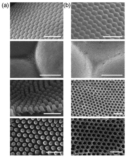 To fabricate moth eye-like nanostructures artificially, the soft imprint lithographic technique can be used to generate a negative mold with materials like perfluoropolyether (PFPE), as shown in Figure 12b, which can then be used to generate another positive mold that mimics the morphology of the eye surface. Another method, based on a bioinspired templating technique, allows us to fabricate anti-reflection coatings on single crystalline silicon substrate. In doing this, a silica colloidal crystal-polymer nanocomposite is fabricated using spin coating, in which polymer is etched with oxygen plasma, Si is etched with SF6 reactive ion etching (SF6 RIE) and silica is etched with hydrofluoric acid to obtain silicon nipple arrays mimicking moth eye []. Figure 14 demonstrates this fabrication technique. A slightly altered route is followed by Linn et al. [] to fabricate similar nanostructures. A third method involves fabrication using the roller nanoimprint technique []. Here, a master layer containing nanoscale structures is pressed sequentially on a UV-sensitive resist which has been spin coated on a silicon substrate. This UV-sensitive resist acts as an etching mask when moth-eye like patterns are transferred to the substrate using inductively coupled plasma etching or reactive ion etching to form conical protuberances.
