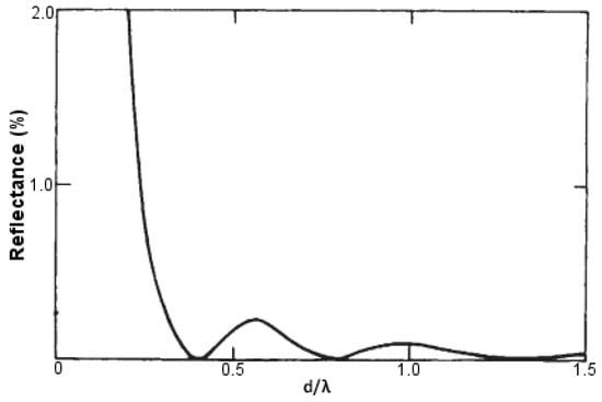 Computed dependence of the reflectance levels in fabricated moth eye-like structures on the ratio of the height of conical protuberances with the incident wavelength of light (d/). Adapted with permission from Macmillan Publishers Ltd: Nature [], copyright 1973.