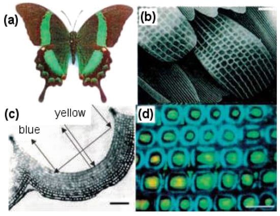Butterflies are of particular interest for studying nanostructures because they have a rich diversity of scales coating their wings that bring about beautiful colors and patterns (see Figure 15). The arrangement of scales follows an overlapping roof tile pattern with a scale density of 200–600 per mm2 depending on the species. Apart from the simple roof tile pattern, scales further possess voids, complicated groove shapes and stratification, which allow them to display complex optical effects, like light scattering, diffraction and interference []. It is interesting to note that color is usually linked with chromophore pigments, which are responsible for chemically displaying the color, but in the case of butterfly wings, various optical phenomena of light taking place on physically-patterned scales are responsible for color generation [] (see Figure 15c).