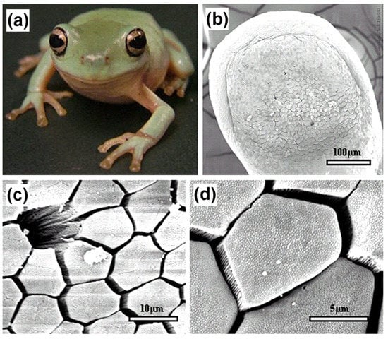 Adhesive surface of the frog toe pad. (a) Immature White’s tree frog (Litoria caerulea) with snout to vent length of approximately 40 mm; (b) Low resolution scanning electron microscopy (SEM) image of the whole pad of a juvenile frog; (c) Medium resolution SEM image showing the mucous pore and (mainly) hexagonal epithelial cells separated by channels at their distal ends; (d) High resolution SEM image showing the presence of nanostructures on the surface of the epithelial cells []. Reproduced with permission from The Journal of Experimental Biology.
