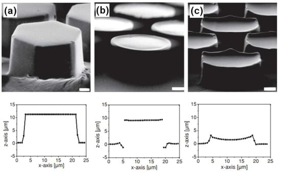 Biomimetic hexagonal surface textures. Scanning electron microscopy (SEM) images of polydimethylsiloxane (PDMS) arrays of hexagonal micropillars (15–19 m diameter) terminated with (a) flat tips, (b) T-shaped tips (10 m height, 3 and 5 m channel width) and (c) concave tips (3 m height, 5 m channel width). Scale bars correspond to 2 m. Below, the corresponding profiles of pillars as obtained with confocal microscope are shown [].