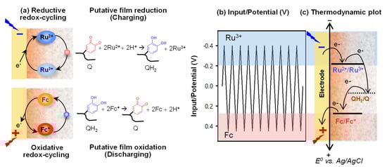 Proposed redox-cycling mechanism of redox-capacitor. (a) The reductive redox-cycling reaction of Ru3+ can reduce the quinone moieties (charge, QH2) and the oxidative redox-cycling reaction of ferrocene dimethanol (Fc) can oxidize the catechol moieties (discharge, Q). (b) Electrical input potential. (c) Thermodynamics requires electrons to be transferred from more reducing (more negative) potentials to more oxidizing (more positive) potentials.