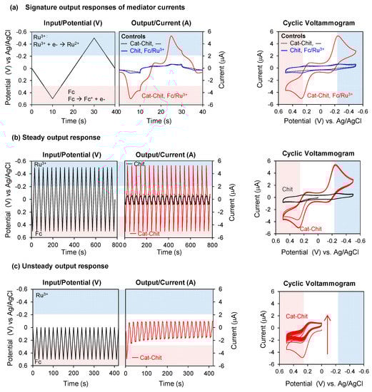 In contrast to the case of steady input–output, Figure 4c shows an example of unsteady response characteristics. In this unsteady case, the left plot of Figure 4c shows a more limited potential range was imposed (+0.5~0 V) to provide the oxidative voltages required to oxidize Fc but to provide reducing voltages that are insufficient to reduce Ru3+. Figure 4c shows the current output response for this unsteady case has no Ru3+-reduction peaks and the amplified currents of Fc-oxidation decrease progressively over time. Presumably, this decay in Fc-oxidation currents occurs because the catechol–chitosan film is progressively depleted of electrons during the repetitive Fc-redox-cycling reaction, but this film cannot be replenished with electrons because the imposed voltage is never sufficiently reductive for Ru3+-reductive redox-cycling. This unsteady output current response also illustrates the gating function of Ru3+: since the imposed voltage remains too oxidative (relative to the E0 for Ru3+), then reductive redox-cycling mechanism cannot be engaged to recharge the film with electrons. Under this condition, no Ru3+-reduction currents are observed and the progressive discharging of the film leads to a progressive decay in Fc-oxidation currents.