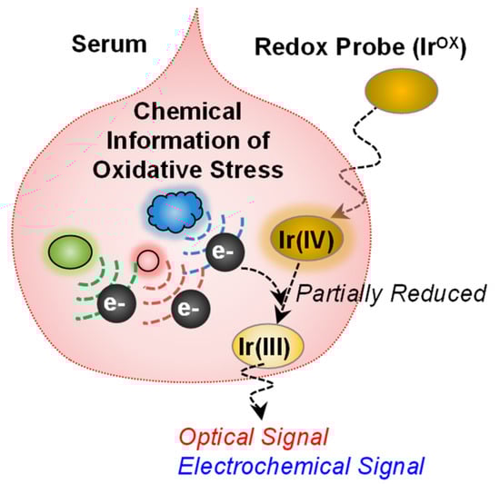 Redox-probing to access chemical information of oxidative stress. The redox mediator (K2IrCl6, IrOX) can probe chemical information relevant to oxidative stress in blood. The information can be transmitted into optical and electrochemical modalities. Adapted with permission from []. Copyright (2017) American Chemical Society.