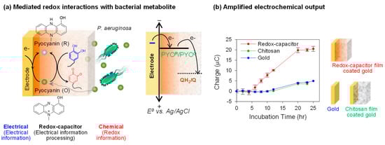 Figure 7a shows that P. aeruginosa secretes the redox-active metabolite PYO that can diffuse through the redox-capacitor film []. The diffused PYO can be electrochemically reduced at the electrode when the cathodic potential is applied and then the reduced PYO can diffuse back into the film and donate its electrons to the redox-capacitor film. Thus, PYO can undergo reductive redox-cycling with the redox capacitor film and yield amplified output currents that could facilitate detection of P. aeruginosa.