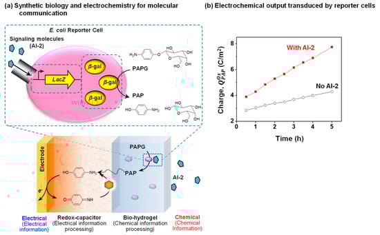 As observed in previous example, some biologically important chemicals are redox-active (e.g., signaling molecules PYO and AS). In these cases, electrochemical methods can be used for direct detection. However, not all molecules are redox-active and in these cases, electrochemistry cannot be directly employed for detection. An emerging approach is to enlist synthetic biology (synbio) to create engineered cells that can recognize a specific chemical and transduce this recognition event into a redox-based signal. For instance, an important bacterial quorum sensing molecule, autoinducer-2 (AI-2), is not redox-active and a synbio reporter cell has been constructed to recognize AI-2 and convert this chemical information into a redox signal that can be electrochemically detected [,]. Figure 9a illustrates that this E. coli reporter cell transduces the AI-2 molecular input into the expression of the enzyme β-galactosidase (β-gal) that can convert a redox-inactive substrate (p-aminophenly β-d-galactopyranoside (PAPG)) into a redox-active product (p-aminophenol (PAP)).