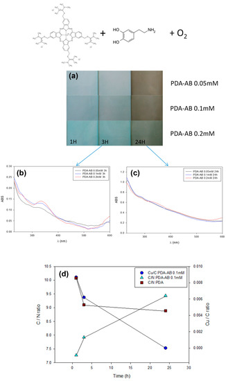 Composites obtained by adding Alcyan Blue (AB) in an oxygenated dopamine solution as shown at the top. (a) Digital pictures of glass slides after being put in dopamine–AB blends with AB concentrations of 0.05, 0.1, and 0.2 mM after 1, 3, and 24 h of reaction. The dopamine concentration was the same, 10.6 mM, in all experiments and the films were deposited from 50 mM Tris buffer at pH 8.5 using dissolved O2 as the oxidant. (b) Ultraviolet-visible (UV-Vis) spectra taken on quartz slides put in dopamine–AB mixtures after 3 h of reaction and increasing the AB concentration from 0.05 to 0.2 mM as indicated in the inset. (c) UV-Vis spectra taken on quartz slides put in dopamine–AB mixtures after 24 h of reaction and increasing the AB concentration from 0.05 to 0.2 mM as indicated in the inset. (d) Evolution with time of the Cu/C (●) and the C/N (▲) ratios for the polydopamine (PDA)–AB (0.1 mM) films, and the C/N (■) ratio for the PDA films. These atomic ratios are obtained from X-ray photoelectron spectroscopy (XPS). Reprinted from [36], Copyright (2015), with permission from Elsevier.