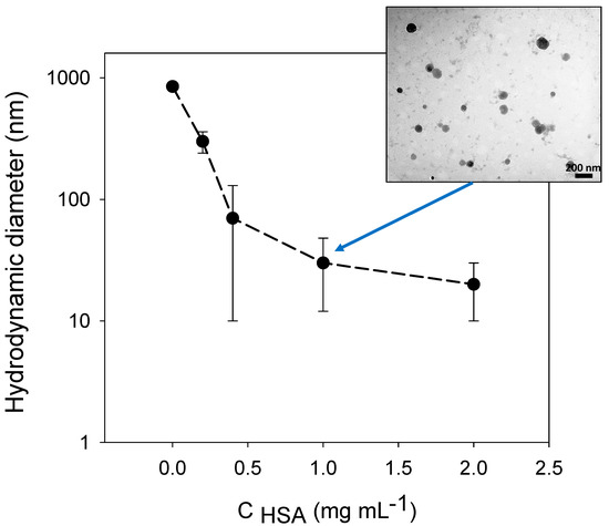 Variation of the hydrodynamic diameter of polydopamine (PDA) particles, as measured by dynamic light scattering; with the concentration of human serum albumin (HSA) added in the dopamine solution (10.6 mM in the presence of 50 mM Tris buffer at pH = 8.5). Dopamine has been oxidized with dissolved O2 (open vessel) for 24 h at room temperature before the measurement. Reprinted from [52], Copyright (2014), with permission from Elsevier. The inset (personal data from the author) represents a transmission electron micrograph of the PDA suspension obtained in the presence of HSA at 1 mg mL−1.