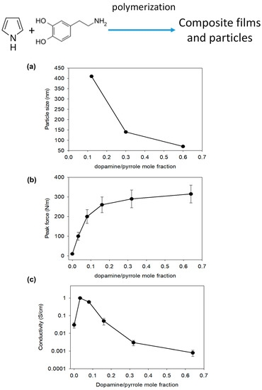 Influence of the presence of dopamine in pyrrole solutions on the properties of the obtained particles. (a) Particle size as determined by dynamic light scattering and films; (b) Peak force in peeling tests; (c) Electrical conductivity after polymerization in the presence of ammonium persulfate. Pyrrole and dopamine structures are shown at the top. Adapted with permission from [68].