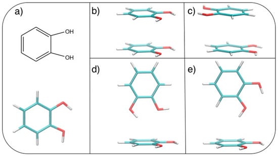 (a) Catechol structural formula (top) and graphical representation (bottom). Stacked dimers: (b) face-to-face (FF) and (c) antiparallel face-to-face (AFF); T-shaped (TS) dimers: (d) TS1 and (e) TS2. C: Cyan; H: White; O: Red.
