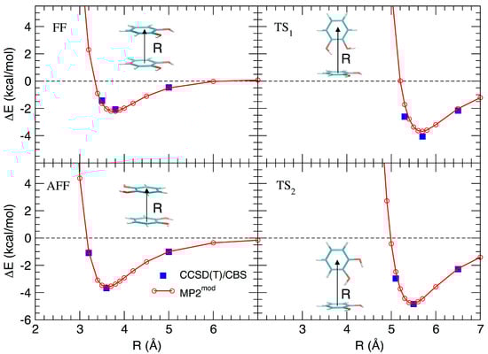 Based on the results recently achieved for several heteroaromatic dimers, where stacked and T-shaped (TS) conformers where found to be the most stable, four starting arrangements have been set up by placing the two monomers at different distances and relative orientation. Namely, the face-to-face (FF, Figure 1b), the antiparallel face-to-face (AFF, Figure 1c), and two TS conformations, one with both hydroxyls (TS1, Figure 1d) and one with only one hydroxyl (TS2, Figure 1e) pointing towards the other ring. Following the protocol recently developed in our group [66], the MP2mod best exponents were determined as follows: starting from each of the four selected conformations, a set of dimer arrangements was created by displacing one monomer along a selected coordinate R, defined as the line connecting the centers of the two rings, as shown in the insets of Figure 2. Next, an estimate (data not shown) of the interaction energy (ΔE) of the resulting dimer geometries was obtained at the MP2mod level, employing the basis set recently optimized by us for quinhydrone [27], thus obtaining preliminary interaction energy profiles. Three points (displayed as blue squares in Figure 2) were selected for each profile (namely one in the minimum, one in the short distance range and one in the attractive branch of the curve) and the corresponding CCSD(T)/CBS interaction energies were computed and used to build a reference database containing 12 elements. This database was then used for the optimization of the exponents of the polarization functions of the 6-31G** basis sets suitable for MP2mod calculations. The starting exponents of the standard 6-31G** basis set are 0.80 for d functions on carbon and oxygen and 1.1 for p functions on hydrogen. After optimization, the best exponents were found to be 0.27 and 0.34 for the d functions on carbon and oxygen, respectively, and 0.36 for p functions on hydrogen. The final standard deviation, , see Equation (3), resulted to be less than 0.3 kcal/mol with respect to the CCSD(T)/CBS energies.