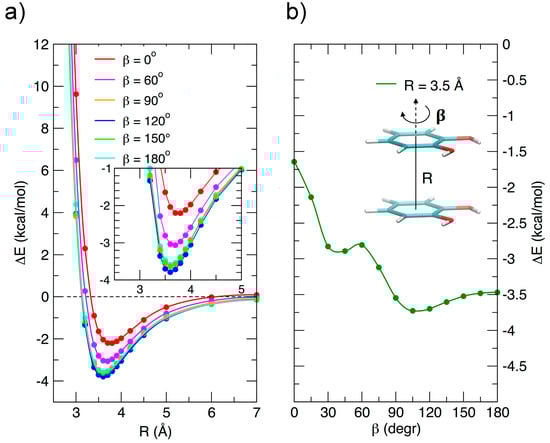 Due to its importance, the stacked arrangement has been studied with some care as a function of the ring–ring distance R and of the angle β, which expresses, as shown in Figure 3b, the relative rotation of the two rings with respect to the line connecting their centers. The relevant results are reported in Figure 3. In the left panel, the interaction energy, reported vs. R for assigned rotation angles, shows minima at similar R values for all angles, and a marked dependence on β at low vales (from 0 to 60°), whereas for β > 90° the curves are close to each other: at the minimum the interaction energy changes by only ≈0.25 kcal/mol in the range 90–180°. Although this behavior seems roughly consistent with a dipole–dipole interaction, the resemblance of the 90, 120, 150, and 180° curves is an indication that higher multipoles, or, equivalently, local dipoles, should play a role in an electrostatic rationalization of the observed energy curves. This is in agreement with the idea of Wheeler and coworkers [45,46] that stacking interaction in substituted aromatic species is strongly influenced by the local interaction of the substituents, rather than to changes induced in the π electronic density upon substitution, as suggested by older models.