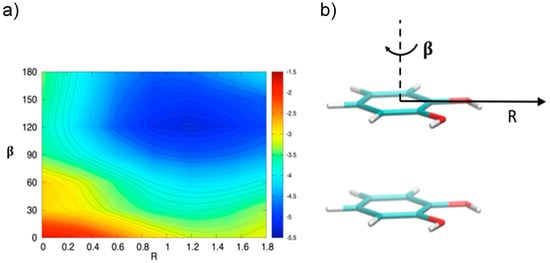 Figure 4 clearly shows that the dimer is much more stable when displaced and rotated with respect to the FF arrangement, with a minimum at R ≈ 1.2 Å and β ≈ 130°. It is noteworthy that the effects of horizontal displacement (i.e., varying R) and β rotation can be ascribed to different origins, closely related to the catechol molecular structure. In fact, the increase of the binding energy upon displacement closely resembles the well-known behavior of the benzene dimer [47,49,50] originated from a “pure” aromatic interaction: shifting one monomer along the R coordinate diminishes the quadrupolar repulsion between the two rings [49], whereas the attractive dispersion interaction decreases to a lesser extent, hence resulting in a global increase of the binding energy [47,49]. As discussed above, the energy profile vs. β rotation is strictly connected with the presence of OH substituents, as suggested by the net increase of the interaction energy in going from a parallel (β = 0°) to an antiparallel (β = 180°) arrangement.