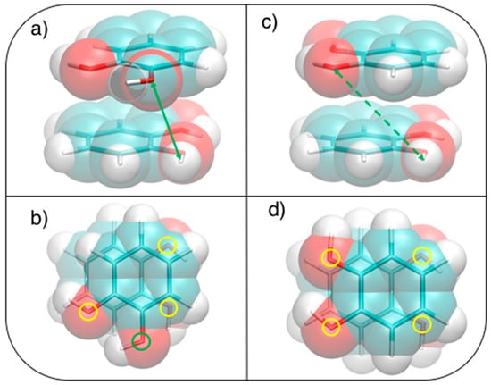 This simple picture is consistent with the minimum of −5.2 kcal/mol (R = 1.2 Å, β = 120°) in a displaced near antiparallel configuration, not coincident with the perfect antiparallel arrangement (β = 180°) where the MP2mod interaction energy is −4.7 kcal/mol. This subtle difference can find a rationale at a closer look of the molecular structure, embracing Wheeler’s idea that unexpected substituents effects can be explained by considering their direct interaction with the neighboring cloud of the other ring [44,45,46]. The β = 120° and β = 180° conformers are displayed in Figure 5. In Figure 5b,d, where a top view of both dimers is shown, the positions of the oxygen atoms are marked with colored circles, to put in evidence the differences between the two arrangements. It appears as in the β = 180° geometry all oxygen atoms lie approximately above a C=C bond of the other ring, resulting in an unfavorable electrostatic interaction with the carbon π orbitals, while at β = 120° only three oxygen atoms contribute to such repulsive term. Consistently, the Hartree–Fock contribution to the total MP2mod energy, which is repulsive in both cases, increases by 1 kcal/mol, in going from β = 120° (3.3 kcal/mol) to β = 180° (4.3 kcal/mol). Finally, another possible source of attractive interaction comes from the HB interaction between the hydrogen atom of one hydroxyl group and the closest oxygen of the other ring, as evidenced in Figure 5a,c, where it appears as in the β = 120° conformer the hydrogen atoms lie at much closer distances (3.7 Å).