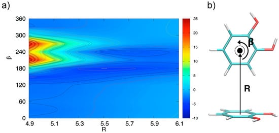 In order to verify this assumption, the MP2mod computational feasibility has been exploited once again to explore an additional IPES section, related to the TS conformers and shown in Figure 6. At small inter-ring distances, the dependence on β-rotation is striking and the most favorite conformer at R = 4.9 Å is found at β = 0° (i.e., the TS arrangement shown in Figure 6b), with the interaction energy (−2.4 kcal/mol) very similar to the value reported for the benzene dimer in the same configuration [49,50,53,57,71]. Conversely, due to the small distance between the H hydroxyl atom and the other catechol ring (see for instance TS1 in Figure 2), the interaction energy in the 180–300° range is repulsive, with a maximum of almost 25 kcal/mol at β = 270°. The situation changes dramatically by increasing R, as in the 180–300° range the interaction energy shows a much steeper gradient. In fact, the IPES section minimum is found in a TS conformation at β = 270° and R = 5.5 Å, where the hydroxyl group points towards the other ring plane similarly to the TS2 arrangement shown in the right bottom panel of Figure 2, resulting in a total interaction energy of −5.1 kcal/mol.