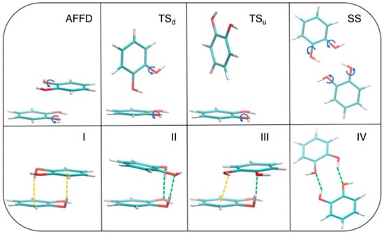 The above described competition between stacked and TS geometries misses although another player, which could significantly alter the delicate balance between them. In fact, apart for a small contribution to the stability of the β = 120° conformer in the stacked conformations, the HB contribution was never decisive to the total interaction, due to too large distances between the involved hydrogen and oxygen atoms, which could be reduced by allowing internal rotation around C–O bonds. In order to find even more stable structures, we have released such constraint and performed a full optimization at MP2mod level, starting from four different conformations (see Figure 7, top panels). The first starting geometry is a displaced AFF (AFFD). Next, two TS structures were prepared, with one or both hydroxyl groups pointing down towards the other ring (TSd and TSu, respectively). Notice that the latter is very similar to that taken from crystallographic data and investigated by Estévez et al. [67]. Finally, a fourth arrangement was built from scratch, where the two rings are placed in side-by-side (SS) conformation, with both hydroxyl groups resulting at close distance, thus maximizing the effect of HBs. All optimizations ended up successfully in four different local minima, as confirmed by a frequency calculation purposely carried out for each of the resulting structures. The corresponding optimized structures are shown in the bottom panel of Figure 7 as I, II, III, and IV, respectively.