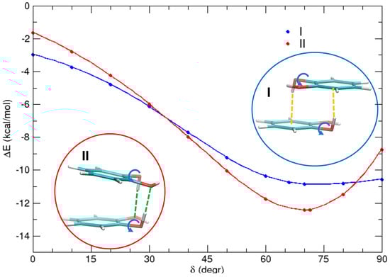 Finally, it is interesting to investigate the different HB contributions in the two most stable conformations I and II. This can be done by performing a rigid scan of the rotation angle δ of the two hydrogen atoms with respect to the C–O bond in both conformations (δ). The results are shown in Figure 8. For δ = 0° (i.e., when each hydrogen is coplanar to the aromatic ring), dispersion interactions are the main source of attraction, although perturbed by the electrostatic interaction between the dipoles, which favors dimer I (in an antiparallel alignment) by ≈1 kcal/mol with respect to dimer II. As δ increases, both the hydrogen atoms involved in the rotation come to closer distances from the other monomer, and may establish HBs. These noncovalent interactions remarkably stabilize both complexes, by almost 7 kcal/mol in I and more than 10 kcal/mol in II. These differences can find a rationale by looking at the insets of Figure 8. In dimer I, since each hydrogen points approximately towards the center of the neighboring ring, two weak HBs of the OH–π type are settled whereas, in dimer II, both hydrogen atoms are involved in a stronger OH–O HB. As a consequence, the minimum of the latter conformer is stabilized by ≈2 kcal/mol with respect to I.