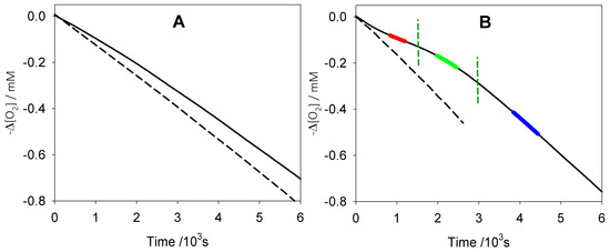 Oxygen consumption during the autoxidation of tetrahydrofuran (THF, 3.1 M) initiated by 2,2′-azobis(2-methylpropion-amidine)dihydrochloride (AAPH, 0.025 M) at 30 °C without inhibitors (dash) or in the presence of quercetin (solid). (A) In phosphate buffer 0.1 M pH = 2.1 with quercetin 2.5 × 10−5 M; (B) In phosphate buffer 0.1 M pH = 7.4 with quercetin 5.0 × 10−6 M, vertical lines indicate the time lapse corresponding to the trapping of n = 2 peroxyl radicals.