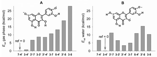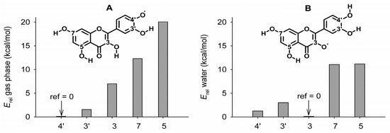 Relative stability of the neutral radicals obtained by H-atom abstraction from quercetin, calculated in the gas phase (A) and in water (B), determined from the relative energy (Erel) with reference to the most stable species (ref = 0). Numbers on the x-axis indicate the position of the radical.