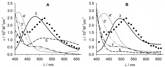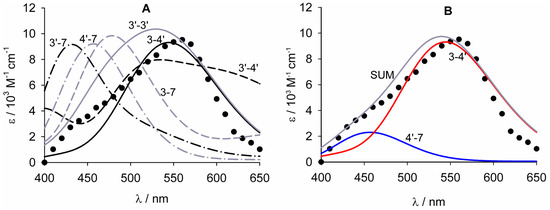 Considering the spectra calculated in water, which seems the most appropriate approach in the case of charged species, the radical anion that more closely matches the experimental spectrum is that involving the positions 3-4′. Its calculated λmax at 547 nm originates from two transitions at 538 and 561 nm. The assignment of the experimental spectrum to the radical anion in position 3-4′ agrees with the relative stabilities of the various species reported in Figure 4. The λmax for the radical anion in position 3-3′ (see Figure 5) is at lower wavelength (530 nm) than that in position 3-4′, due to the convolution of the main transition at 554 nm with minor transitions between 470 and 512 nm. This radical anion was calculated to be less stable than that in position 3-4′ by 6.6 kcal/mol. The radical anion in position 3-4′ has two transitions, with comparable intensity at 513 and 620 nm, originating from a large absorption band which does not reproduce the shape of the experimental spectrum. This radical is less stable than that in position 3-4′ by 3.4 kcal/mol. The radical anions involving the 5–OH (not shown in Figure 5) are destabilized by at least 10 kcal/mol with respect to the radical anion in position 3-4′, and have the main absorption peaks at about 470 nm. All radical anions involving the 7–OH group show absorption maxima between 435 and 480 nm, that may be responsible for the shoulder at 450 nm visible in the experimental spectrum. Considering the radical anion in position 4′-7 as the one showing the closest electronic transition, we obtained a good matching of the experimental spectrum by simulating the UV–vis spectrum that would arise from the mixture of radical anions in positions 3-4′ and 4′-7 in the ration of approximately 3:1 (Figure 5B).