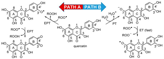 Possible reaction pathways for quercetin in water. Two mechanistic possibilities, arising from current literature, could account for the antioxidant activity of quercetin in water solution: Path A illustrates the electron–proton transfer (EPT) to peroxyl radicals from the catechol moiety, while Path B depicts the sequential proton loss electron transfer (SPLET = PT/ET) to water/peroxyl radicals. ET: Electron transfer; PT: Proton transfer.