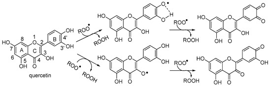 Quercetin is perhaps the most famous flavonoid antioxidant: a member of the flavonols family, bearing a catechol moiety (ring B) linked in position 2 to the polyhydroxylated chromen-4-one core (Scheme 1). It is found in a large variety of dietary vegetables [1], which makes its presence in raw food nearly ubiquitous, and the typical daily intake was estimated as 25 mg/person/day in the U.S. diet [2]. Some sources such as capers, dill, cilantro, radish, carob, fennel, radicchio and onions are particularly rich, with 30–230 mg of quercetin or its glycosides per 100 g of edible portion [1,2,3,4,5], while green and black tea infusions have been reported to contain, respectively, about 480 and 330 mg/L of quercetin glycosides [1]. Considering that oral bioavailability can be as large as 50% (including its phenolic metabolites) [1,3], clearly, under a vegetable-rich dietary regime, quercetin can significantly contribute to the physiological antioxidant defense. Quercetin has also been attributed a range of healthy biological activities, including anti-inflammatory, blood vessel protecting, anti-platelet aggregation, antiviral, anti-cataract, enhancement of cognitive function, and anti-cancer [1,2,6,7,8,9]. Although regulatory agencies such as the European Food Safety Authority (EFSA) indicate that there is insufficient clinical evidence to support them [10], it is noteworthy that many such health-related claims are directly or indirectly associated to quercetin’s purported antioxidant activity. Its antioxidant activity has also recently been exploited, for instance, in the development of bioinspired synergic nano-antioxidants [11], or of co-delivery vincristine–quercetin nanodrugs for the treatment of lymphoma [12], and it has inspired the design of pH-responsive nanocarriers for drug release [13]. Owing to its importance, the antioxidant activity of quercetin has been the subject of many investigations [14,15]; however, surprisingly little is known about the actual mechanism and relevant quantitative values of its antioxidant activity under biomimetic settings (i.e., on the mechanism and absolute kinetics of reaction with peroxyl radicals [16,17,18,19,20] in water).
