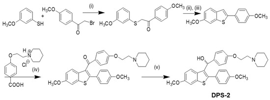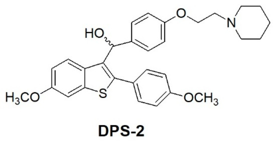 The intermediate ether side chain methyl 4-(2-(piperidin-1-yl)ethoxy) benzoic acid hydrochloride was prepared by alkylation of methyl p-hydroxybenzoate with 1-(2-chloroethyl) piperidine hydrochloride by means of powdered anhydrous potassium carbonate, followed by base hydrolysis. Friedel–Crafts acylation of 6-methoxy-2-2(4-methoxyphenyl)-benzo[b]thiophene with methyl 4-(2-(piperidin-1-yl)-ethoxy) benzoic acid chloride and lithium aluminium hydride (LAH) reduction of the corresponding benzo[b]thien-3-yl ketone provided the desired (4-(2-(piperidin-1-yl)ethoxy)phenyl)(6-methoxy-2-(4-methoxyphenyl)benzo[b]thiophen-3-yl)methanol (DPS-2). (4-(2-(Piperidin-1-yl)ethoxy)phenyl)(6-methoxy-2-(4-methoxyphenyl)benzo[b]thiophen-3-yl)methanone hydrochloride (0.120 g, 0.2088 mmol) was dissolved in tetrahydrofuran (THF;1.2 mL) and the corresponding solution was cooled at 0 °C. Then LAH was added (0.019 g, 0.5 mmoL) and the reaction mixture was stirred at 0 °C for 45 min under argon. After the completion of the reaction (as monitored by TLC), THF (3 mL), THF/H2O (4 mL) and H2O (4 mL) were added. The product was extracted with methylene chloride (2 × 30 mL) and the organic phase washed with water (10 mL) and saturated solution of sodium chloride (10 mL). It was dried over anhydrous sodium sulfate and concentrated in vacuo. The residue was purified with flash column chromatography using CHCl3/MeOH (97:3) as eluent. We obtained 0.1 g, 89% yield, of a light yellow oil which solidified in the freezer.