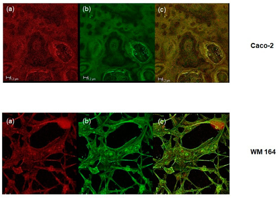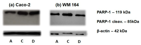 Figure 5a) very likely, reflecting the difference in each cell line’s doubling time (48 h in WM 164 vs. 62 h in Caco-2). In both cell lines, the cytotoxic effect was prominent at 72 h and further enhanced in Caco-2 cells when treatment was kept as long as 96 h (