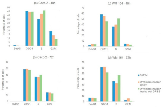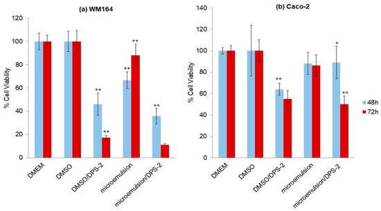 Hence, following the structural characterization, the developed microemulsions, empty as well as loaded with DPS-2, were submitted to in vitro biological evaluation in MW 164 skin melanoma and Caco-2 human epithelial colorectal adenocarcinoma cell lines. The choice of these cancer cell lines is justified by the use of microemulsions for transdermal and oral drug delivery [