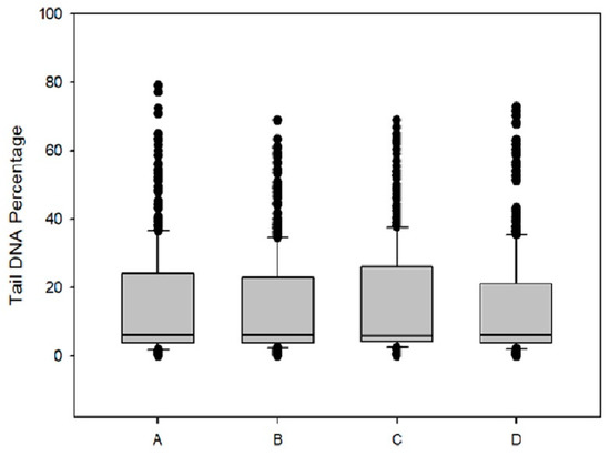 27]. Images were obtained at ×400 magnification using a fluorescence microscope. From each slide >100 cells were selected and photographed randomly. The percentage of DNA in the tail, relative to the head, was calculated using ImageJ OpenComet software [