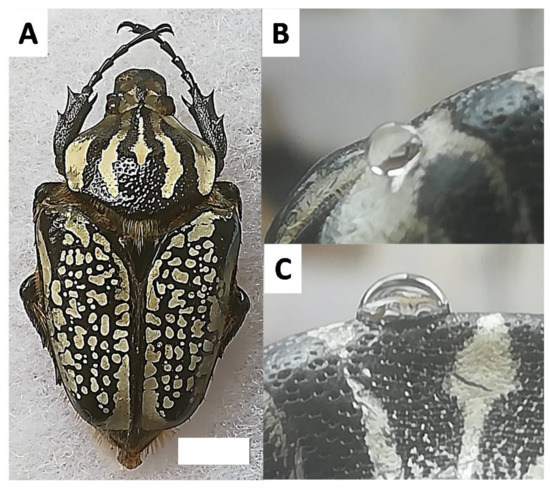(A) Specimen of Goliathus orientalis (Moser, 1909); scale bar: 1 cm. (B) Water droplet deposited on the white part of the G. orientalis pronotum. (C) Water droplet deposited on the black part of the G. orientalis pronotum.