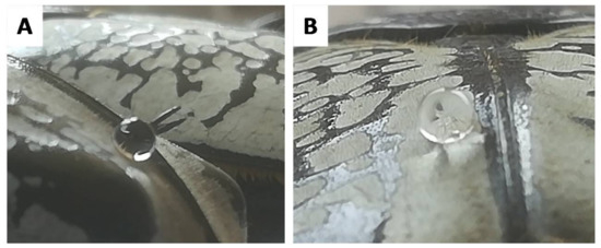 The presence of microhairs on the white part made the observation and discernment of the triple point complicated precluding the accurate analysis of the contact angle (Figure 4B). Interestingly, the side observation of the black part of the elytron did not reveal hair-like microstructures (Figure 4C), and the apparent contact angle of the black part was measured with more accuracy (Figure 4D). To further understand these observations, dynamic measurements were performed on both black and white parts. Not surprisingly, considering the high contact area provided by the microhairs on the white part, and the relatively low degree of hydrophobicity on the black features, both surfaces showed high adhesion of water and can be described as parahydrophobic (Figure 5). A water droplet would remain stuck to the surface even if the surface was tilted by 90°. This precise combination of static and dynamic wetting behavior is also known as the petal effect in the literature [18,19,20,21]. This property is often exploited in nature when water harvesting and collection is necessary for survival [22,23,24,25,26,27,28,29,30,31,32,33,34,35,36].