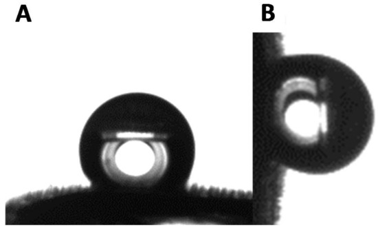 Example of parahydrophobic features observed on the white part of a G. orientalis elytron. Water droplet on (A) horizontal and (B) tilted surface.