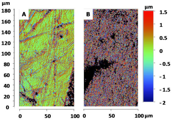 To confirm these observations regarding the differences between the black and white surfaces, roughness measurements were performed. The measurements revealed a significant difference between the black (Figure 6A) and the white (Figure 6B) surfaces.